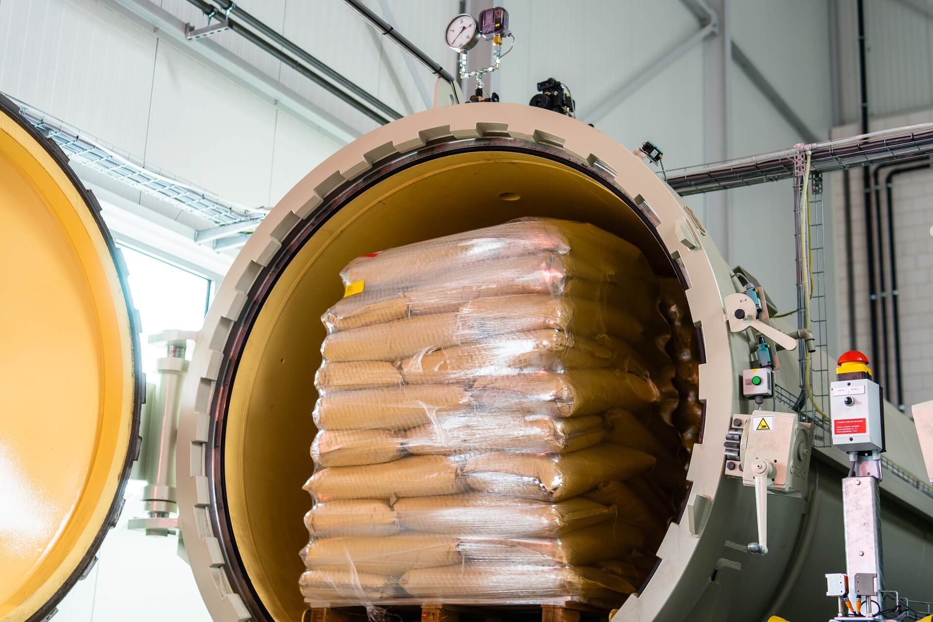 De pallets worden geheel verpakt in de drukkamers geplaatst. Beide kamers hebben een gebruikerslengte van 12 meter en wegen ieder zo’n 25 ton.